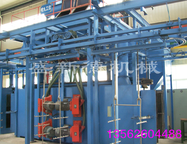 懸鏈?zhǔn)綊佂枨謇頇C(jī)是一種單行程懸鏈連續(xù)式拋丸清理設(shè)備,它具有工件靜態(tài)裝卸、自動(dòng)快速輸送與定位,工件旋轉(zhuǎn)拋丸清理。整機(jī)采用常規(guī)電器控制,工件的輸送軌道無級(jí)調(diào)速。適合于大批量、鑄鋼、鑄鐵、及焊接件的全方位拋丸清理,用于各種形式的可吊掛式工件。通過拋丸清理,不但可以去除工件表面的銹蝕,清理掉結(jié)構(gòu)件上的焊渣,還可以消除工件的焊接應(yīng)力,提高工件的抗疲勞強(qiáng)度,增加工件噴漆時(shí)的漆膜附著力,并達(dá)到提高整個(gè)工件表面及內(nèi)在質(zhì)量的目的。廣泛用于冶金、石油、化工、機(jī)械等行業(yè)。