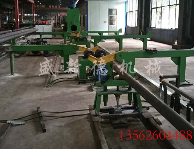 包括移動(dòng)小車,旋轉(zhuǎn)輪組,減速機(jī)驅(qū)動(dòng)及管徑調(diào)節(jié)裝置。此系統(tǒng)設(shè)計(jì)簡(jiǎn)單、實(shí)用、維修方便、生產(chǎn)效率高等優(yōu)點(diǎn)。旋轉(zhuǎn)輪采用橡膠壓配成型,從而降低了鋼管與旋轉(zhuǎn)輪摩擦所產(chǎn)生的表面粗糙度。移動(dòng)小車可根據(jù)鋼管的長(zhǎng)度來調(diào)節(jié)小車的距離,六米至十三米均可。減速機(jī)驅(qū)動(dòng)設(shè)有變頻器可調(diào)節(jié)鋼管的旋轉(zhuǎn)速度。管徑調(diào)節(jié)裝置可調(diào)節(jié)輪組之間的距離從而適合于不同的管徑。