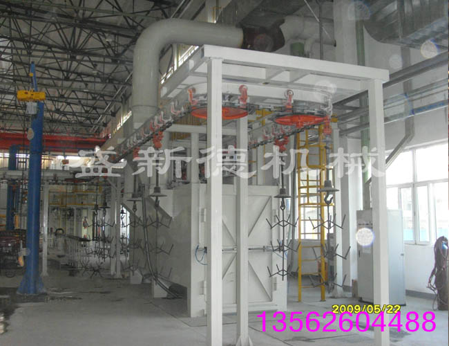 懸鏈?zhǔn)綊佂枨謇頇C(jī)是一種單行程懸鏈連續(xù)式拋丸清理設(shè)備,它具有工件靜態(tài)裝卸、自動(dòng)快速輸送與定位,工件旋轉(zhuǎn)拋丸清理。整機(jī)采用常規(guī)電器控制,工件的輸送軌道無級(jí)調(diào)速。適合于大批量、鑄鋼、鑄鐵、及焊接件的全方位拋丸清理,用于各種形式的可吊掛式工件。通過拋丸清理,不但可以去除工件表面的銹蝕,清理掉結(jié)構(gòu)件上的焊渣,還可以消除工件的焊接應(yīng)力,提高工件的抗疲勞強(qiáng)度,增加工件噴漆時(shí)的漆膜附著力,并達(dá)到提高整個(gè)工件表面及內(nèi)在質(zhì)量的目的。廣泛用于冶金、石油、化工、機(jī)械等行業(yè)。