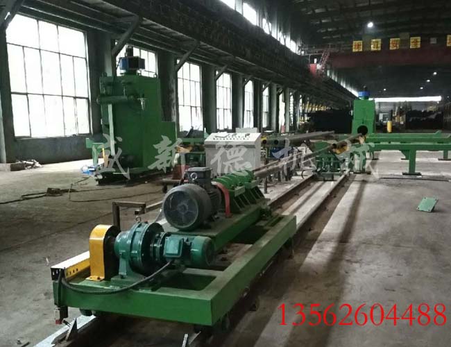 包括移動(dòng)小車,旋轉(zhuǎn)輪組,減速機(jī)驅(qū)動(dòng)及管徑調(diào)節(jié)裝置。此系統(tǒng)設(shè)計(jì)簡(jiǎn)單、實(shí)用、維修方便、生產(chǎn)效率高等優(yōu)點(diǎn)。旋轉(zhuǎn)輪采用橡膠壓配成型,從而降低了鋼管與旋轉(zhuǎn)輪摩擦所產(chǎn)生的表面粗糙度。移動(dòng)小車可根據(jù)鋼管的長(zhǎng)度來調(diào)節(jié)小車的距離,六米至十三米均可。減速機(jī)驅(qū)動(dòng)設(shè)有變頻器可調(diào)節(jié)鋼管的旋轉(zhuǎn)速度。管徑調(diào)節(jié)裝置可調(diào)節(jié)輪組之間的距離從而適合于不同的管徑。
